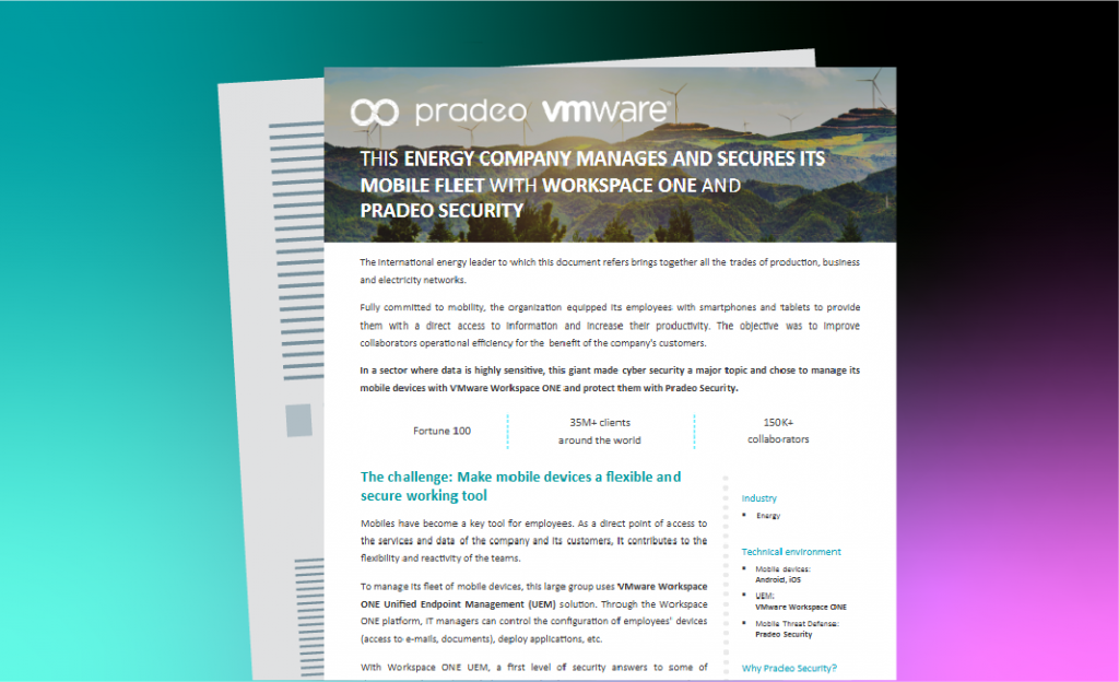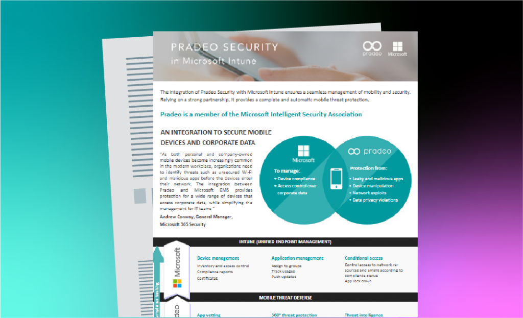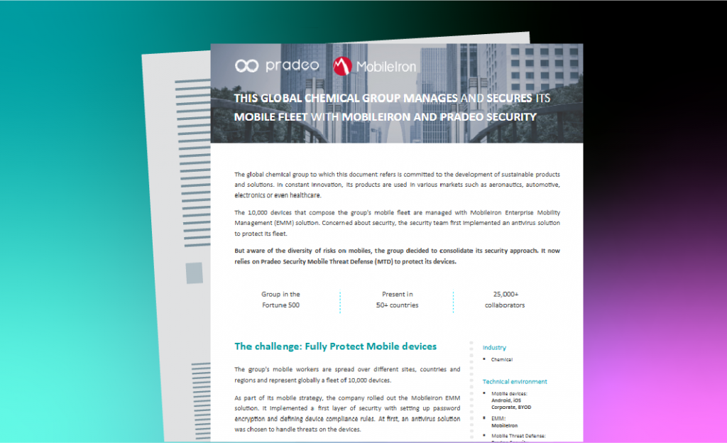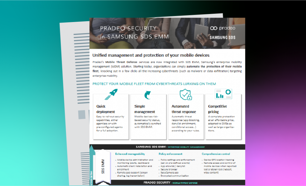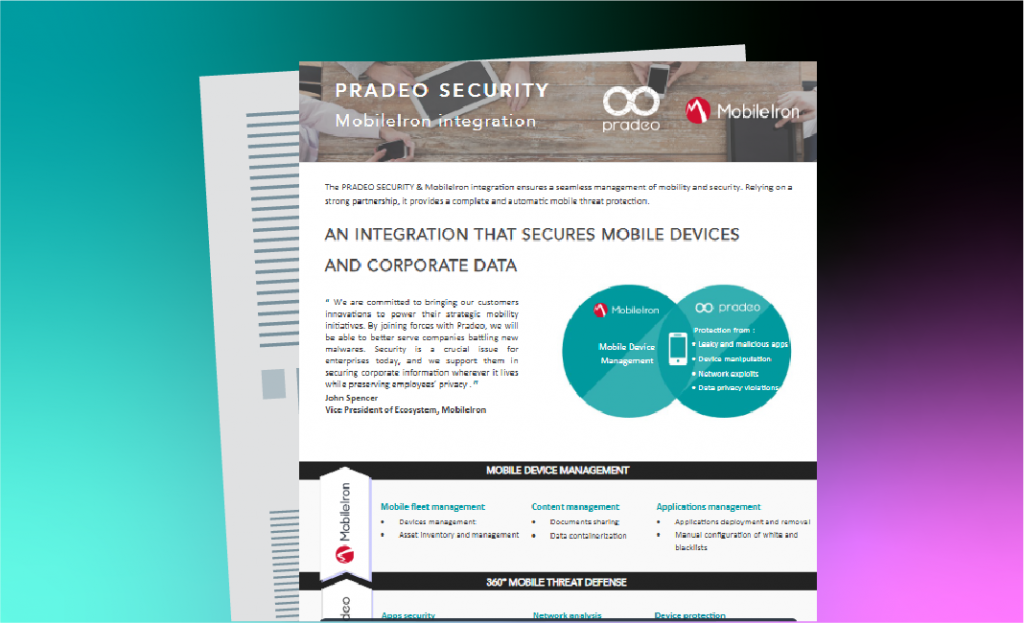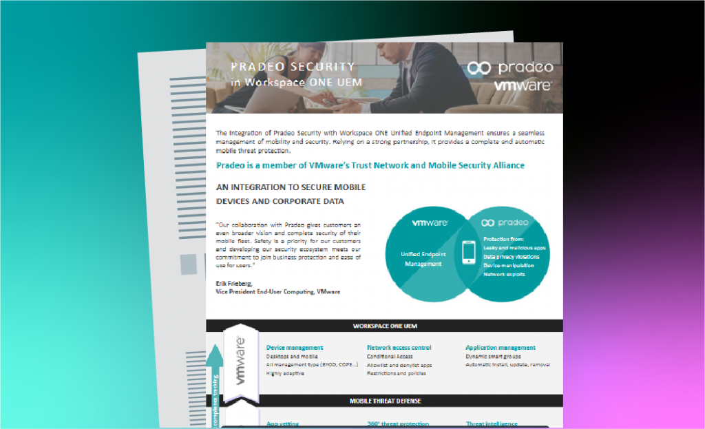 Our integration briefs provide essential guidance on seamlessly integrating Pradeo’s cybersecurity solutions into your existing IT  infrastructure. Ensure a smooth transition and optimal threat detection with Pradeo’s guides on integrating with VMware Workspace ONE, Microsoft Endpoint Manager, IBM MaaS360, …